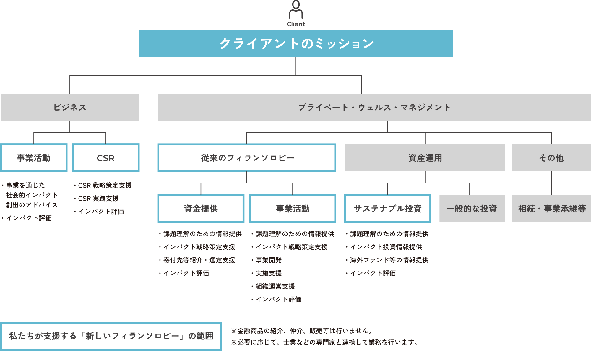 私たちは、「新しいフィランソロピー」を、一般に「非営利」とされる社会貢献活動に限定していません。ビジネスや資産運用においても、個人が実現したい「ミッション」や「価値観」に基づき、社会に良いインパクトをもたらすことができるからです。